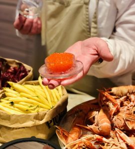 Lördag och söndag serveras brunch i Lykke (325 kr), med mycket fisk och skaldjur på buffén. Skumpa till halva priset också!