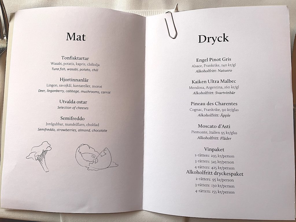 Kvällens fyrarätters består av Tonfisktartar, Hjortinnanlår, Utvalda ostar och Semifreddo. YUM! Vi väljer att ta vinpaketet till, fyra viner för 425 kr per person. Vår servitris Emilia är helt fantastisk och får alla att trivas och må gott. En stjärna, helt enkelt!
