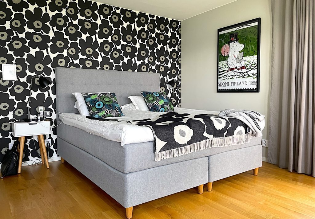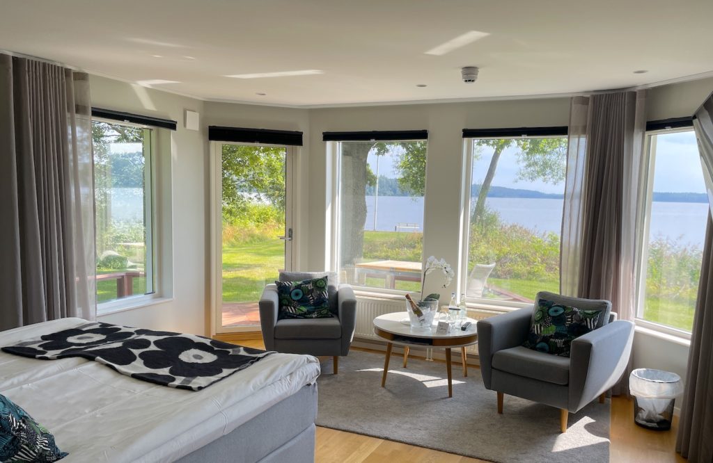 Rummet är, som sig bör, klätt i Marimekkos Unikko-mönster och fin Mumin-tavla. Champagnen står på kylning och utsikten är helt fantastisk. Vilket ställe! Det är en mycket varm dag för att vara slutet av augusti men rummet är svalt och skönt.