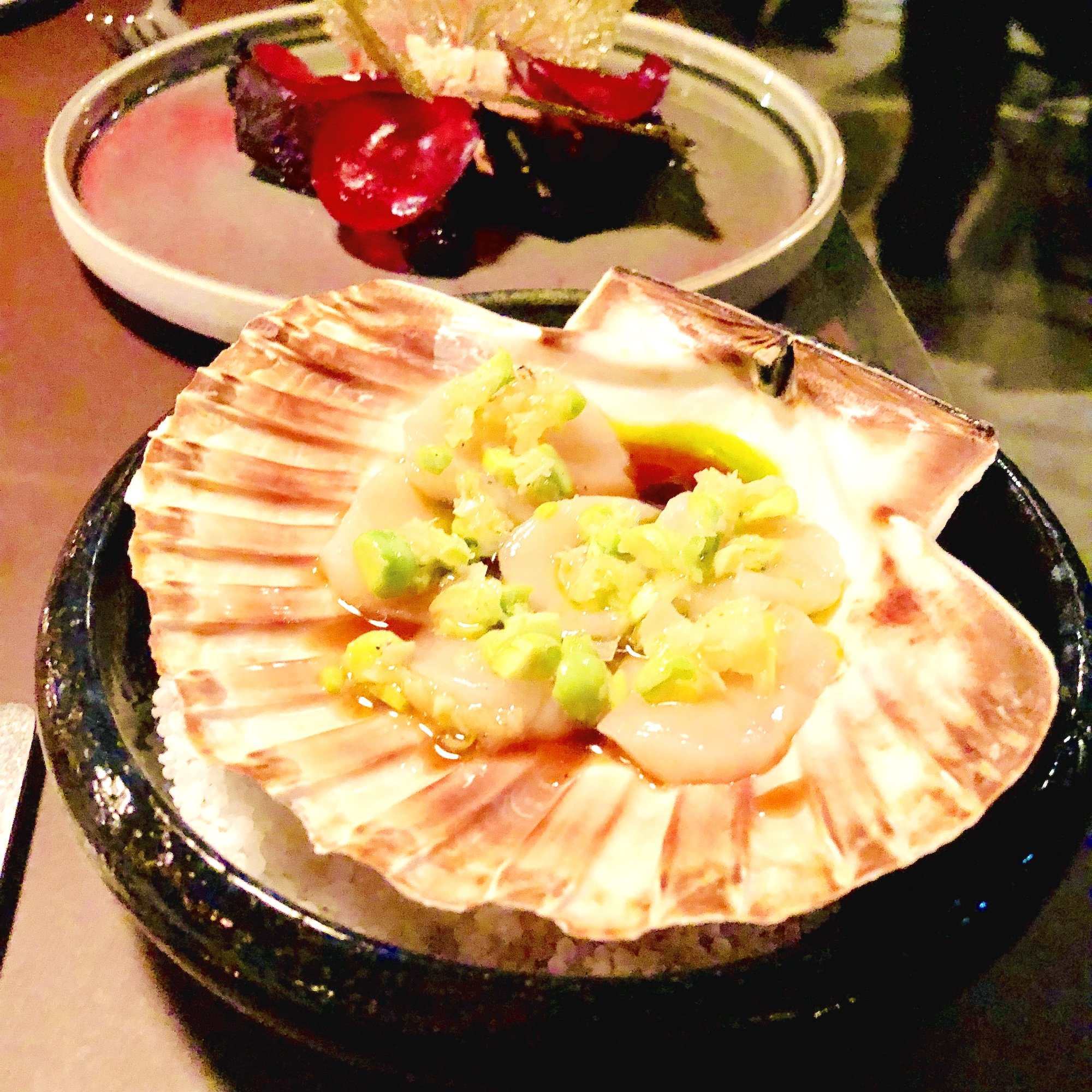 Maten känns inte klassiskt fransk utan är moderna tolkningar. Jag och min vän Ylva tog in fem utav de små rätterna att dela på. Betor med ingefära och kycklinglevercrème var en helt underbar rätt som jag kommer att måsta beställa även vid nästa besök. Pilgrimsmusslorna med gröna ärtor gjorde inte samma starka intryck och fanns på menyn med kvällens råvaror.