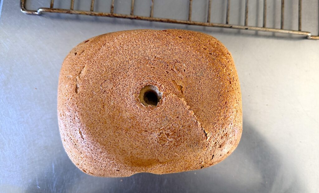 Innan vi köpte vår bakmaskin lånade vi en av före detta kollegan Gunilla. Hon hade inte använt den på ett tag men hos oss gjorde den succé och maken beställde raskt hem en egen maskin. När vi fick hem den undrade Gunilla om det fortfarande blir hål i bröden. Japps det blir det. Precis där själva ”vispen” suttit.