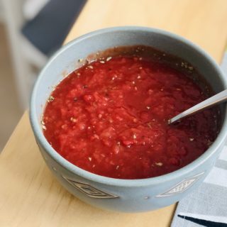 - Häll tomater i en skål. Har du inte finkrossade kan du använda vanliga och köra dem slätare med en stavmixer.