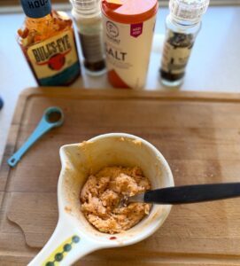 - Gör kryddsmöret. Blanda rumsvarmt smör med BBQ-sås, salt, svartpeppar och chiliflakes. Smaka av och ställ kallt till servering.