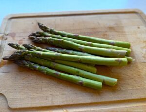 - Bryt av ändarna på sparrisen. Olja och strö över flingsalt. Grilla sparrisen på 200 grader i 10 minuter. Rör om efter halva tiden.