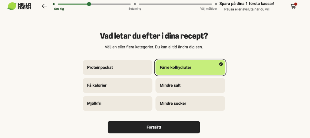 Jag testar HelloFresh och i ett samarbete med dem kan jag ge dig som testar för första gången chans att spara upp till 1.099 kr på dina fem första kassar. Jag har valt tre middagar för två personer. Det svåraste var att välja rätter, för de har massor som jag tycker låter goda och ser lockande ut. Du kan välja recept med mera proteiner, få kalorier eller mjölkfritt. Vissa kanske vill prenumerera på en ”matkasse” för att slippa gå och handla. För mig som gillar att gå i matbutiker är det mer ett utmärkt sätt att få in nya rätter i min repertoar.