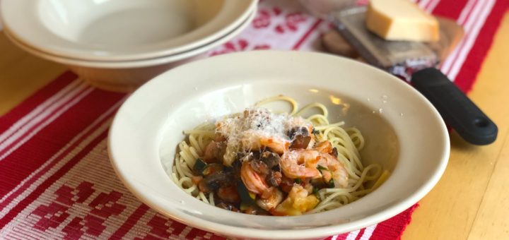 Detta recept på Pasta med räkor och svamp har länge varit ett av mina favoriter. En snabblagad rätt så snart du skalat räkorna. Massor av god smak från tomater, vitt vin, färsk basilika och...
