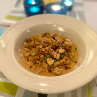• Lägg en portion nudlar i en skål. Häll över den krämiga soppan. Toppa med teriyaki-tofu och servera med krispig chili i olja och ev salladslök.