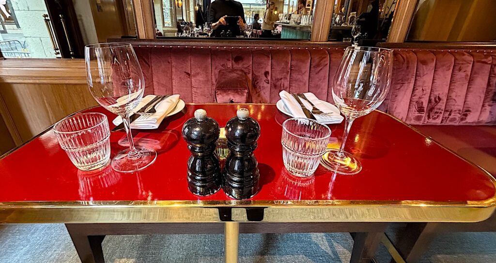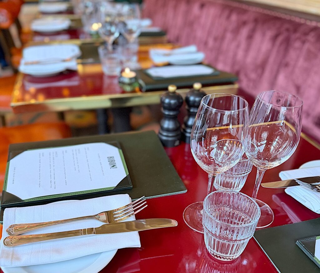 På flera ställen i Bibon har man dukat upp så att man sitter intill varandra när man äter. (Eller brödvid – som vi Turunens brukar säga.) Det äääälskar jag! Så trevligt att ha samma utsikt att tala om. Det känns så superfranskt och bra. Kommer du med en ny kärlek som du vill titta djupt i ögonen så finns även vanliga bord.