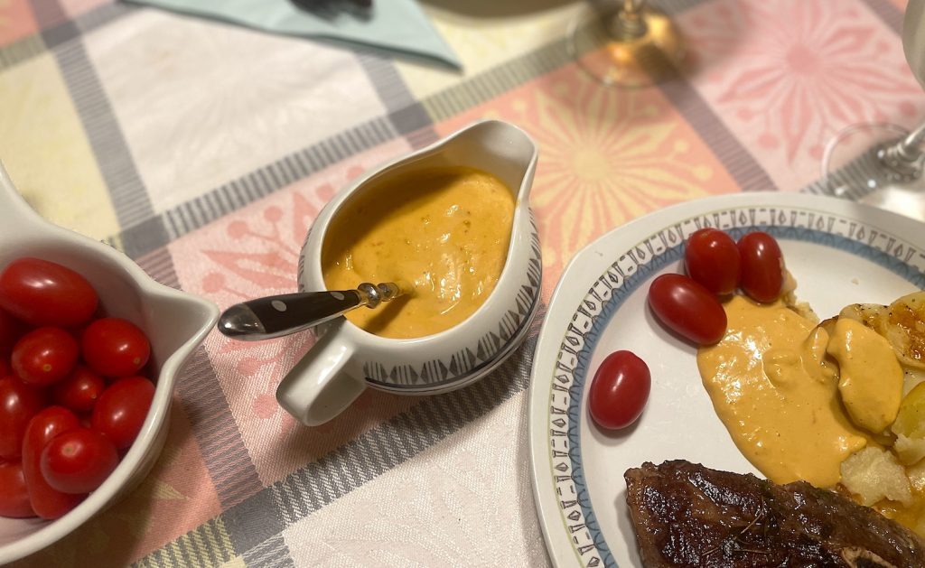 Sean Connery-sås passar till allt! Här äter vi den till rött kött och rostad potatis. Jag gör min med rostad vitlök istället för rå riven vitlök som det var i originalreceptet.