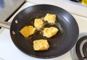 - Använd två matskedar för att klicka i kluttar av smeten, ca 1/2 msk för varje plätt. För att platta ut dem, doppa baksidan av en stekspade i smöret, platta till potatisklutten. Då fastnar den på baksidan av stekspaden. Dra av den mot kanten på stekpannan så får du något som liknar en liten plätt.