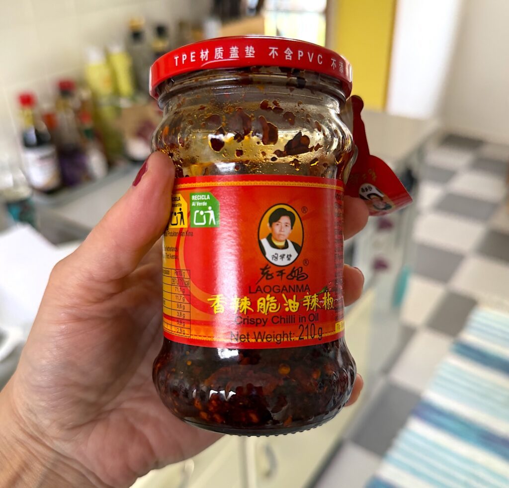 Crispy chilli i olja från Laoganma är en populär krydda som innehåller krispiga chiliflingor i sojabönsolja, sichauanpeppar, fermenterade svarta bönor och lök. Den är inte tokstark men tillfär en massa smak. Jag använder som topping på soppor, äggrätter, i köttfärssåsen, ja lite här och där helt enkelt.