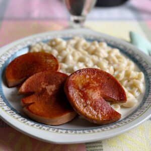 - Servera med till exempel stekt falukorv med hög kötthalt.