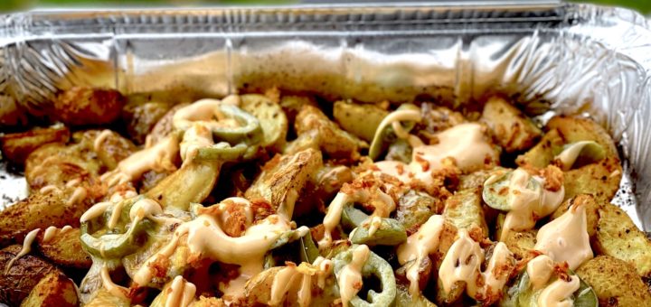 Dirty Fries är egentligen bara pommes frites som toppas med goda grejor och smält ost. Du kan också göra dem på färsk potatis som här. Jalapeños, cheddar, rostad lök och en het dressing gör...
