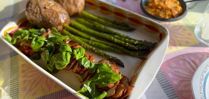 Dubbelmarinerad fläskfilé med bakad potatis och kryddsmör är en perfekt bjudrätt då du kan ha det mesta färdigt långt innan gästerna kommer. Jag serverar rätten med grillad grön sparris just nu, men du väljer...
