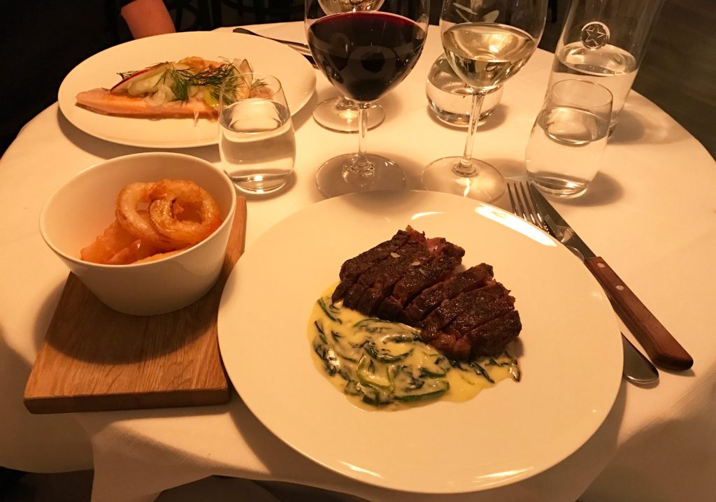 Efter förrätterna tog vi in en underbar röding med picklad gurka, ingefära, blomkål och snökrabba och en biff på mjölkko med parmesastuvad spenat och lökringar.