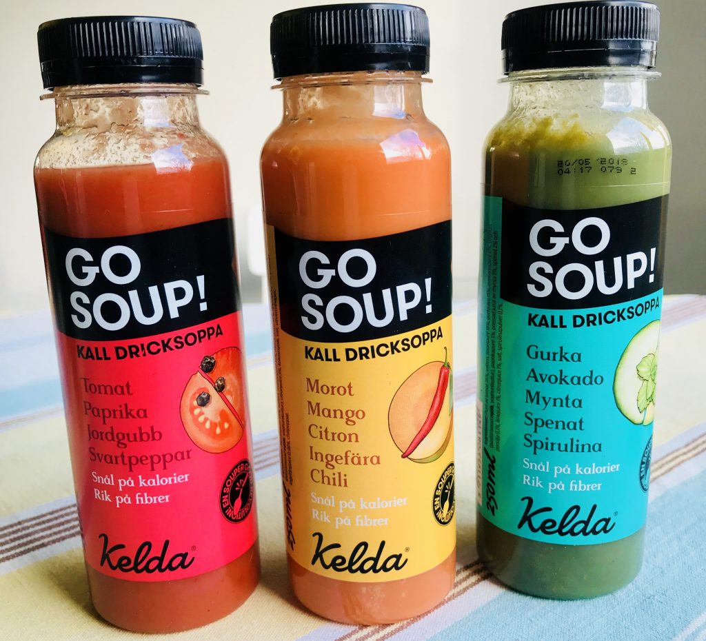 Kelda kommer med nya färdiga ”dricksoppor”. De säljs i plastflaskor på 25 centiliter och ska drickas kalla. Meningen är att de ska vara ett snabbt mellanmål i farten. Jag och min man Tomas testade dem i helgen och gav blandade betyg.