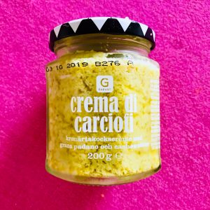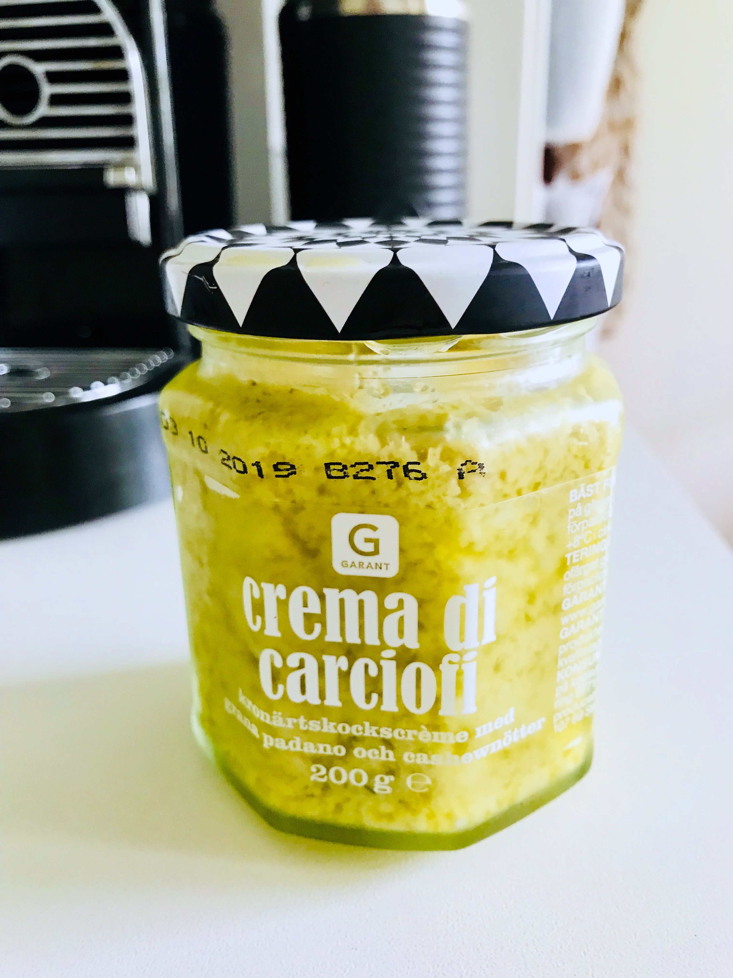 Märket är Garant och den säljs på Willys. På burken står det Crema di carciofi men på Garants hemsida kallar de den för pesto carciofi, om du skulle behöva fråga efter den. Jag tror att en burk pesto carciofi gick på runt 30 kronor. Väl värt det!